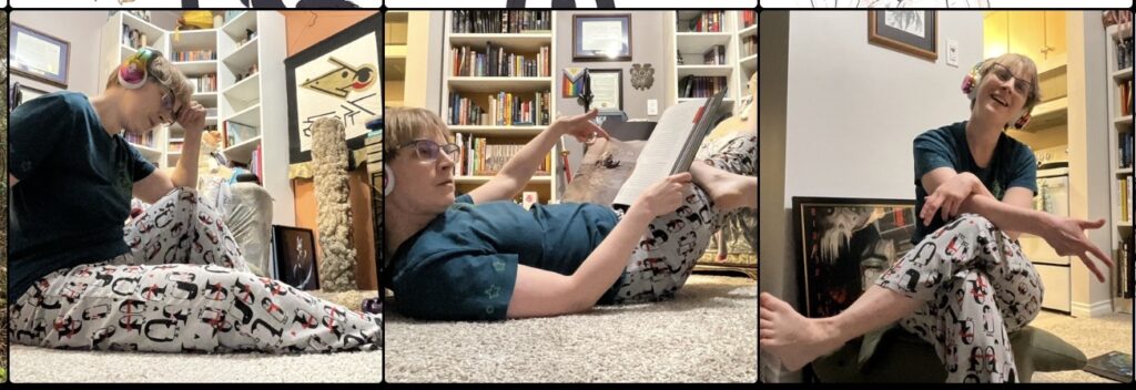 At any rate, feeling better today. I slept (some) and got through my work day. I wrote some! I sketched some. After a few experiments, this year seems to be the year when I’ve finally learned that taking goofy reference photos of myself for art is truly the way to go in order to map out a piece. It makes my phone’s camera roll look ludicrous, but it sure as hell works for getting a drawing off the ground.